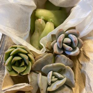 またまたメルカリお迎えっ子😅 デレッセーナの葉挿し8枚、 キュービックフロスト、 緑牡丹、霜の朝。 最初はデレッセーナの葉挿しだけが欲しかったのですが、 2つ目以降は50円引きにしていただける様なので同じ方からカット苗もお迎え💓 おまけも入っていて大満足😍 デレッセーナ丼が出来るのはいつになるでしょう😅
