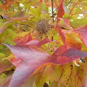 既に投稿されているフウは紅葉が多いようです。この画像は2日前撮影ですがとても美しい黄葉でした。ホワホワの実が沢山付いていました。⁉️この先 赤くなるのかこのまま離層してしまうのか… 別名サンカクバフウ モミジバフウ(アメリカ産)の実に比べススガケノキの様に柔らかそうな実をつけていました。