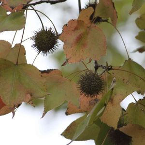 フウの葉っぱ(もっと綺麗に紅葉します)と実 フウ(楓) 中国原産 別名:タイワンフウ(台湾楓)、サンカクバフウ(三角葉楓) マンサク科フウ属 葉っぱは3つに裂ける。 「楓」と書きますが、カエデとはまったく別の植物です。 カエデはカエデ科カエデ属 フウは秋に紅葉するためその姿が日本のカエデとよく似ていたことから、日本では「楓」の文字をカエデと読むようになった(間違えて)とか。