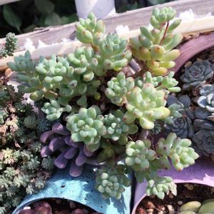 「ブルービーン」 ベンケイソウ科 セダム属 うちのブルービーン 上品でしょ。 よそん家の子より お嬢様な感じ。 キレイなブルーというかブルーグレーな色が気に入ってます。 紅葉しなくていいです。 このままの色が好きなんです。(笑) いつも植物の種類を調べるのウィキペディアがほとんどやけど ブルービーンは調べられなかった。 「セダムとして流通しているが 実際は グラプトペタルム「パキフィルム」の選抜種」って書いてあるのを見っけ。 選抜種って意味がわから~ん。😵🌀 ひきつづき調べます。