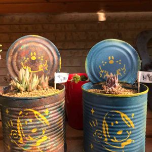 オロスタキス属 白雪爪蓮華とNYBGが大きくなってきて鉢が小さくなったので 蓋付きリメ缶SNOOPYバージョンを作って 植え替えしました´•ﻌ•`