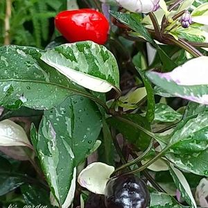 おはようございます。 種から育てた観賞用トウガラシ🌶カリコちゃんの黒い実を発見しました🖤 リーフの色も斑入りで爽やかです🎶