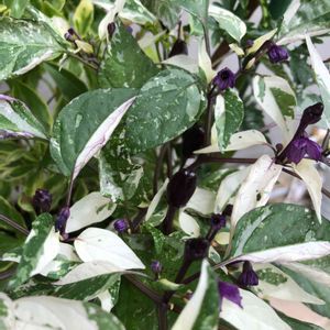 花友さんから種から育てたカリコちゃんを頂きました💜 この子は斑入り葉が涼しげな観賞用の唐辛子です🌶 ツヤツヤの黒い実も可愛いくて大好き🖤⋆͛*͛ 私も来年は種から育てたい❣️💪