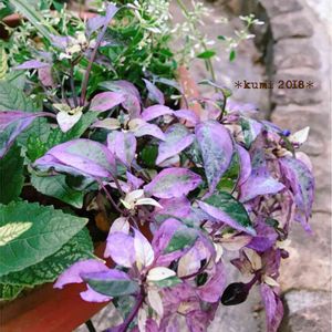 花壇の隅。 こぼれ種から育った、斑入り唐辛子🌶️ 誰かさんと寄せ植えにしてもいいかと思いながら、 そのまんま.... ちょろっと見えてるコリウスもこぼれ種組🌱