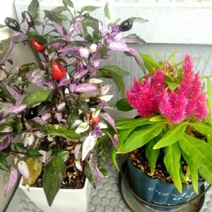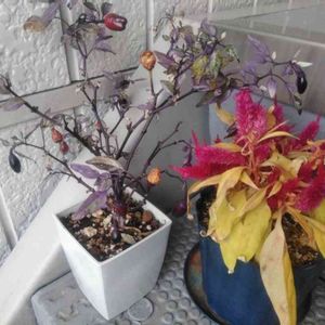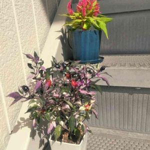 峨眉山が植えてあった鉢が空いたので(下の鉢)。 観賞用トウガラシ‼️食べたらダメですが、かなり辛いらしいです。バンバン農薬を使ってるそうなので食べるのは命懸け😱 この紫の葉と紫から赤に熟す実の色がとてもキレイで即購入~🙆🌿 食べたらダメですよー❌