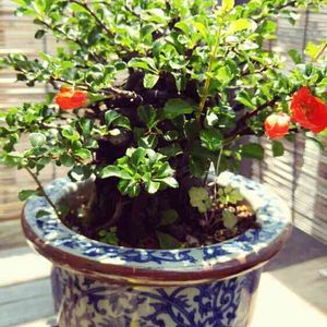 花×盆栽 長寿梅に花が咲きました。 4,5輪ほどですが(^^;))) 今年の6月に比べて夏の暑さで葉がかなり減りました(;´д`) 灌水してもしても追い付きません(´д`|||) 針金掛けが下手なのはお許し下さい(^^;)))
