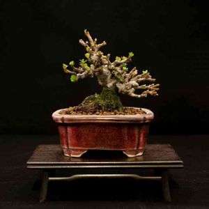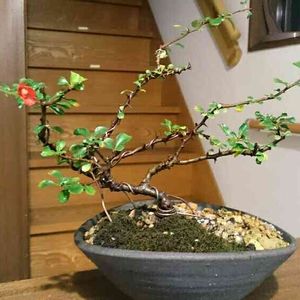 大半の樹はまだですが、動き始めたところからぼちぼちと植え替えを始めています。 今日は長寿梅(白)を植え替えました。枝の所々に赤いプチッとした芽がでてきています。 根の状態はまずまずでしたが、走り根があったので、捌いておきました。ついでに巻いてあった針金を使って少し曲を強めました。 鉢は益子で買った六角鉢です。