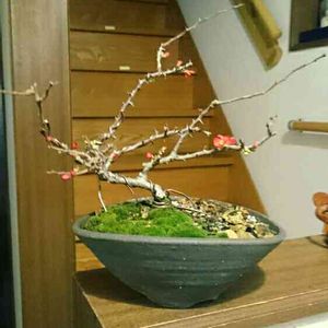 長寿梅シリーズその1 綺麗な鉢に植え替えました~土を盛り上げた植え替えは初めてで、苔を一生懸命他の鉢から移して張りました。_(^^;)ゞ 根が少なかったのが心配(;゚Д゚)弱ってしまったらどうしよう、、、