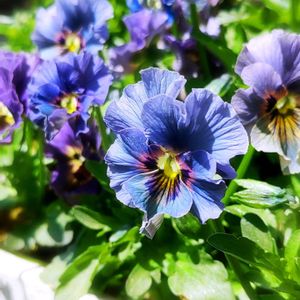 パンジー変わり咲き 天使の誘惑♡ 黄色から紫色へ変化するのですが今は殆どが紫のお花です。 気がついたらこんなに綺麗に咲きそろっていました💜💙💜💙💜💙💜 実は向かって左側に小輪ビオラさんも植っているのですが💦全くお花が咲きません💔 来週気温が上がってきたら変化があるかな〜😆✨