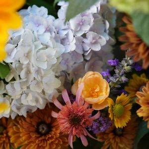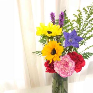 アレンジメント カーネーション、ヒマワリ、リアトリス、キキョウ、ソリダコ、レザーファン