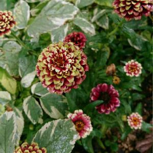 ジニアの〈アズテックバーガンディ〉も 雨で色が映えるね♪ 後ろは斑が涼しげな エゴポディウム〈バリエガータ〉