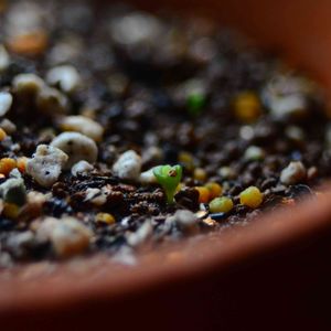 フリチア実生 20まいて 一番最初に出たのが7月28頃で その後3発芽していた後、遅れて出てきたりもして あー4/20だから発芽率まあまあこんなもんかあ、と思っていたが まさか今頃5つ目が出てくるとは 実に3ヶ月 お、おそよう… 君いちおうメセンだけど 夏型じゃないっけ…? ちょっとこれから冬だから 些か心配ではあるが とりあえずハローワールド 嬉しいなあ 今年のうちにまた1mm弱の実生に出会うとは思ってもみなかった
