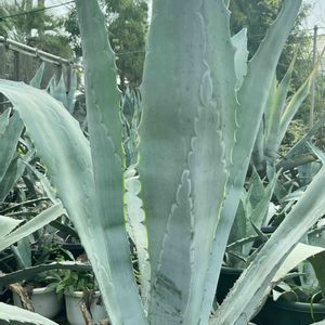 アガベ.アメリカーナ 鉢植えのアガベちゃんの周りに雑草が生え、引っこ抜きました。 葉がチクチク、チクチク…!手も服も引っ掻かれました😭 100年に一度、花を咲かせるとか…。 見てみたいです。