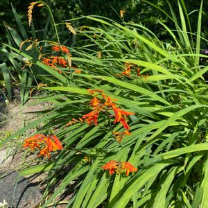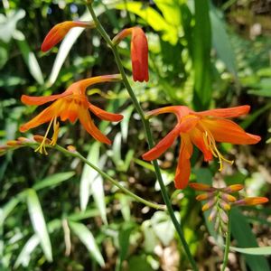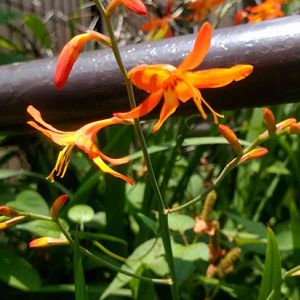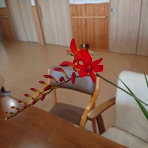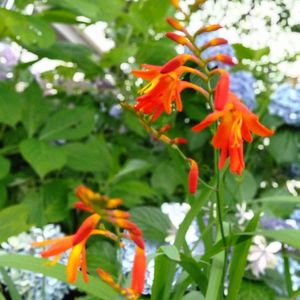 ヒメヒオウギスイセン 姫桧扇水仙 別名 モントブレチア 雑多な物が茂る狭庭。 オレンジ色の花が咲いてる。 毎年、葉だけで花を咲かせなかったよ。 15年ほど、ぶりだね。