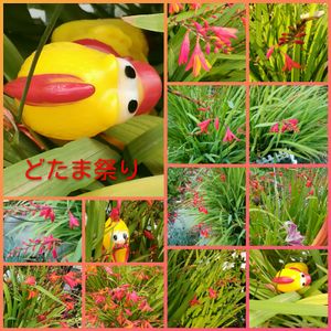 9月1日 My Garden ヒメヒオウギスイセン (クロコスミア) 今月のどたまちゃんは🐓コッコちゃん 母のお気に入りです お庭で隠れん坊のコッコちゃん 🏷どたま祭り 参加させて下さい❣