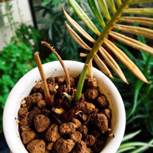 与論島で食堂のおばあちゃんが お土産にくれたソテツのチビちゃん! 東京に持ち帰り植えてみるも 枯れる一方で諦めてた💦 4ヶ月して突然 新芽が出たよ〜🤩 その時に一緒にくれた種もそのうち 動くのかなぁ〜❣️がんばれ〜