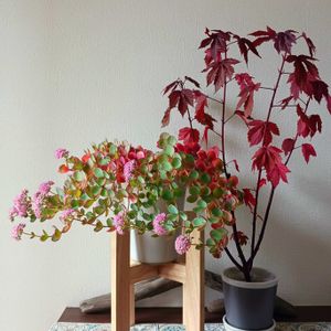 🏷️今日のお花【ベンケイソウ】つながりで ベンケイソウ科ムラサキベンケイソウ属の ミセバヤを🤲 こちらは越中ミセバヤ、父の形見 昨年は葉が青いうちから咲いたけれど 今年は紅葉の方が早かった 父ちゃん見てるー? お隣の紅葉は ハイビスカス(芙蓉)‘マホガニースプレンダー’ 夏の間は銅葉らしいです お花もシックなブラックレッドでカッコいいから お時間あったらググって(タグって)みて 今回はボタニカルアートの生徒さんたちのためのモチーフとして用意しました 今日持っていくのでお別れの記念撮影🍁