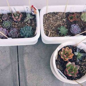 おはようございます🍀 昨夜は 根が張ってる多肉だけ 外に出してました😊 まだ大丈夫そうでしたね👌 こちらは 最近お迎えした子たち💕 冬が来るのでみんなで まとまってもらってます😊 竹串は カラス防止に刺してます😎 ―{}@{}@{}- ←ヤキトリ
