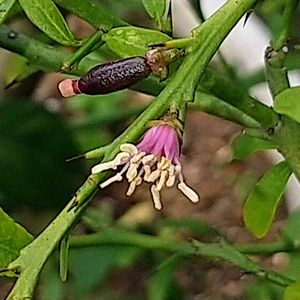 フィンガーライムの花 昨年は、途中で実が落ちてしまい ました。 蕾が10以上あるので、今年は可愛い実が採れると良いなぁ〜♪😋