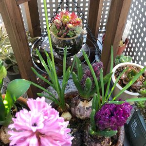 多肉好きなお友達は 「ここが1番好き!」だそうです🌵📸 ごちゃごちゃしてる感じ!って笑 プランターラックにダイソーのハンギングサークルを取り付けてカラフル多肉のステージにしてみました🙂 託児していたヒヤシンスを渡して、お返しにローズマリー貰ったょ🎁