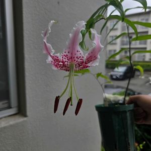 カノコユリorタキユリ? 3年以上前から育てているカノコユリorタキユリが開花しました😍😍 花は反り返りが緩くて柱頭はカノコユリ同様に先端が丸いのが特徴的です。 我が家では物干し竿やロープで無理矢理上向きにしているので分かりにくいですが、3枚目のようなロープに引っ掛けられなかった株はタキユリのように下垂しています。 開花時期はタキユリとカノコユリの中間くらいですね👍 どちらかと断定することは出来ませんが、丁度様々なユリが咲き終わる時期に咲いてくれる上に我が家のカノコユリ系の中ではダントツの増殖率を誇るのでありがたいです😆😆 ※比較用 4.5枚目タキユリ こちらがアルペンガーデンやまくささん由来のタキユリですね。こちらも鉢植え栽培でも下垂するように開花しますね。早咲きで8枚目の柱頭も丸みが無いのでこちらは純粋なタキユリだと思われます👍 同じカノコユリでも色々と個性があって興味深いです😆😆