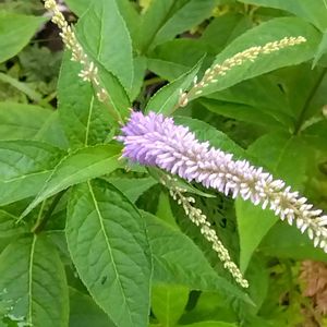 一枚目、紫はクガイソウ 二枚目はオカトラノオ どちらも細長く垂れた花穂が似てますね。葉っぱが違うと教えていただきました