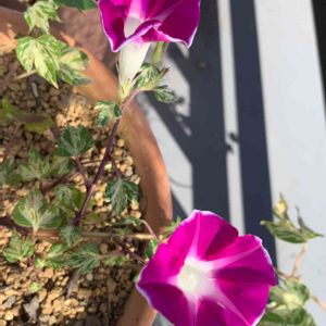 斑入りアサガオさん、今年も溢れ種から発芽の子です。今年はツルを伸ばさず超特急でお花を咲かせてくれました。土は例によってキッチン端材の堆肥と赤玉ミックス。けっこう良い感じの肥料になってるらしい⁉️