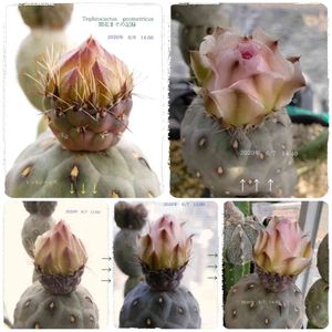 おはようございます( ˊᵕˋ ) 只今、神戸は快晴です.*・゚ .゚・*.☀ 今日は30℃越えの地域もあるようですね。 いきなりの夏日の到来で、身体が付いていけるか少々心配ですが、暑いのは今日一日で明日からは雨が続くようです。 今日しっかり水分補給して無事に乗り切りましょうね。 先日もPicあげていた Tephrocactus geometricus 一昨日からとうとう硬かった蕾がほころんできて、昨日無事にお花を咲かせました💮 開きかけの状態は まるで薔薇のお花のようですね🌹 Picは一昨日の様子です💡 〜続く