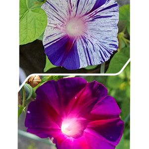 朝顔たち ①②「江戸風情」 どうしたどうした🧐 去年は夏の終わりまで なかなか咲かんかったのに 今朝 えらいしっかり咲いてる👀 一輪だけやけど💦 綺麗やわ😍 この調子でお願い🙏 ③2年生の子たち 仲良く並んで開花🤗 ④「スカーレットオハラ」 名前に惹かれて購入 こぶりの赤い花がよき💓 ちらりと写る 白い朝顔「暁の光」 中心部分が赤いんやけど タイミング難しく撮れず💦 ⑤日本朝顔「サンスマイル」 斑入りの葉が個性的 サンスマイルなのに 葉に隠れるように咲く🙄 おひさまに笑わないの? 調べてみたら つるなし朝顔らしい😳 我が家の朝顔たち 毎朝の観察が楽しみ❣️