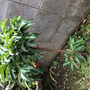 庭の片隅に、ひっそり赤い実をつけてました。 センリョウと思ったのですが、我が家の庭にあるもうひとつのセンリョウとは葉の形や実のつき方、木の姿が違うよう。 センリョウの一種かしら、それとも別もの?分かる方教えてください。