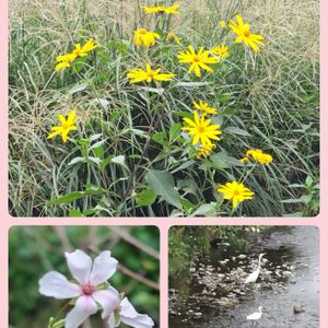 〜 🏃中のお花たち② 〜 多摩湖のある丘陵地を下って少し行くと空堀川という川がありコサギが2羽川の中で餌を求めていました🪽 線路沿いにはすすき🌾やキクイモ❓オオハンゴンソウ❓ そして秋咲きの十月桜なのかそれとも春に咲く桜の狂い咲きなのか桜🌸が咲いてました✨
