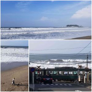おはようございます😊 朝だけ晴れ予報だったのでジョギングで海へ🏃 グリーンじゃなくてブルースナップ🌊 波が高くてサーファーはおらず🚫 荒波で打ち寄せるワカメでも拾ってるのかな?と三陸海岸のような発想で眺めてると、七里ヶ浜を向こうの方からずっとゴミ拾いしてやって来たのは、麦わら帽子がよく似合う小麦色の女神でした👏(左下) ただ走ってる自分が申し訳なくなる思い😓 スラムダンクの踏切も、いつになく立派な波が背後に👀(右下) 台風の被害がなるべく少なく済みますように…