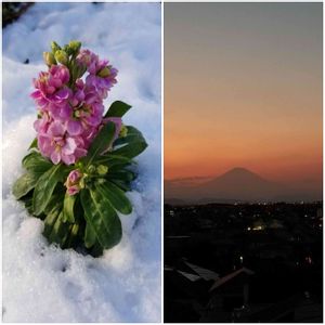 おはようございます😊 今日のお花、ストック 去年1/7撮影、去年は雪降ってたんですね 右は昨夕のジョギングにて撮影🗻