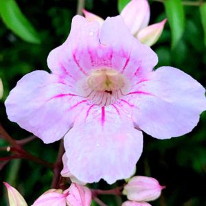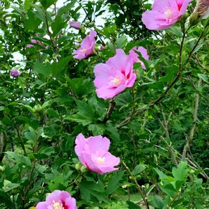 久しぶりの投稿です。猛暑で、我が家の庭の手入れもせず、 草木ぼうぼうで放置してた。花も咲かず、 ひたすらクーラー入れて部屋で涼んで、 ぼうぼうの庭を見てた^ ^ ふと、見上げると、おや?!きれいな花が咲いてる。 幹から、長く大きく伸びた枝の先に 緑の実のような粒と、ピンクの花が、きれい! お前の名前は何というの? 分かる方教えてください!^ ^