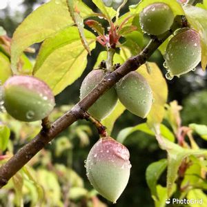 雨上がり☁️の金曜朝、果樹園の中生種の大梅達も果実🥭がハッキリしてきた😃。 ほんのり赤みがかった南高さん、今年は結実良好〜😊。