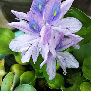 おはようございます(^-^) メダカの鉢の ホテイ草が咲きました☺️ ホテイ草の根っこのお陰でメダカの赤ちゃん(多分100匹位) も生まれて日々成長しながら元気です>゜)))彡