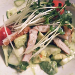 お買い得品の🥑に処分品のズッキーニと島オクラとカイワレ、プチトマト🍅に練り物でパワーサラダ的な。
