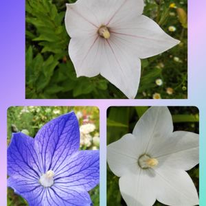 🌸キキョウ🌸 秋の七草 になっているので 秋に咲くと思っている方が多いのですが 丁度今頃咲き始めます! 初夏ですよね! 3色が揃い踏みしましたので載せてみます😊 上のはほんの少しだけピンクなんです。 咲く前のポンポンの時に 無理やり指で挟んでパンって鳴らしたこと、ありませんか? 子供の頃なので、許してね🤗