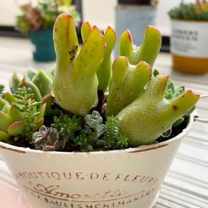 真ん中のウサギみたいなやつの名前を知りたいです。 大きさは5センチくらいで、根本のところは木の皮みたいな茶色い皮が付いています。