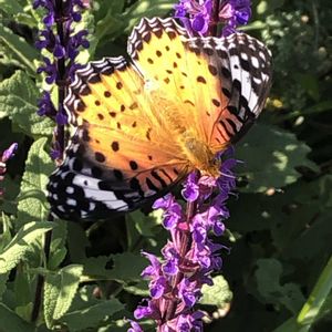 今日は良いお天気です。☀️🙆♀️ 紫色の「サルビア ネモローサ カラドンナ」に「ツマグロヒョウモン」蝶が食事に来ました。💜🦋🐆🥤😊🌞✌️