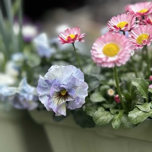 初夏まで楽しむ寄せ植え&鉢植え組、植え付けから少し経ってイキイキしてきました。ノースポールは小さな花芽がつき始め、もうすぐ白い花が咲き始めそうです。 花はそれぞれ、 写真1&2…カレンデュラ・リナリア・スイートアリッサム鉢と、ペニーブラック・姫手毬・スイートラブのビオラ寄せ植え鉢 写真3…イングリッシュデージー「ロリポップ」・ビオラ「ぴーちももか」・ワスレナグサ寄せ植えと泡沫ビオラ「恋暮れ」鉢 写真4…サクラソウ・夢咲ビオラ「青かすみ」・ノースポール寄せ植えと、見元ビオラ鉢 です