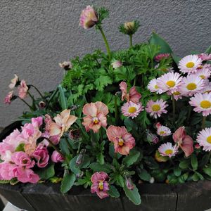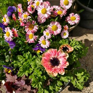 ピンク系でまとめた寄せ植えです😄 12月に植え付けた時はスカスカでしたが春になって賑やかになってくれました🎶 ②2年目のアネモネ。 保管方法が適当だったせいでシフォンダブルかポルトダブルか分からなくなってしまったけれど💦ポルトダブルかな? ③種まきデージー「ロリポップ」と種まきビオラ「ときめきビオラ」 ④チューリップ ⑤12月に植え付けた時の様子。 土の面積の方が多い・・・