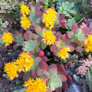 【セダム属ー薄化粧】 おはようございます。 本日は那須の『コピスガーデン』へ 行く予定です✌️ ポカポカ陽気 多肉達にとって最高の天気 薄化粧の花って 綺麗ですよねー🎶 鮮やかな黄色の花が何輪も咲くので 群生株になると圧巻だろうなー 焼きそば屋さんに 薄化粧のみの寄せ植えが飾ってあって すごく綺麗でしたー😁