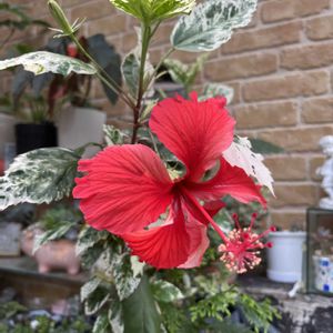 ハイビスカス マリーナサンライズ✨🌺✨ 白の斑入り葉に真っ赤なハイビスカスのお花❤️ とても涼しげです😄🎶