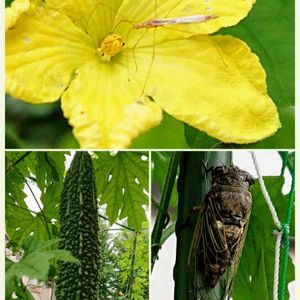 ゴーヤのお花に何かいるよ👀‼️ 蟬さんがお昼休憩してたから少し離れてお花を撮って、家に帰ってよ~く見ると「イトカメムシ」が同化してました😆 これからスポーツクラブへ行ってきます👋😃