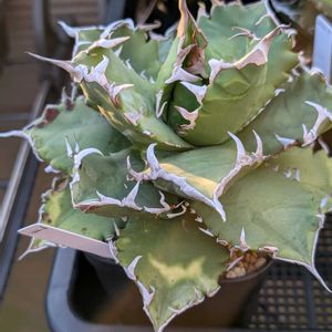 今日のお花 🍀アガベ キジカクシ科 リュウゼツラン属 多肉植物 種類が多く 小型のものから大型のリュウゼツランまで多種 ♡斑入りで小型のアガベ吉祥冠 斑入りのやわらかさと赤紫色の棘が心に刺さった時の1枚のpicです!