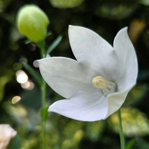 💠今日の花 🤍桔梗💜💠 今朝、久しぶりに絞り咲き桔梗🤍💜 1輪開花✴️ もう1輪、隣の蕾は絞りではなかったですが6枚花弁の白い桔梗🤍❇️