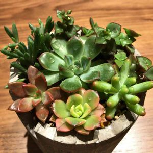 母の日用に寄せ植えを作りました。多肉とセダムであまり手をかけなくて良いように。私にしては詰めて植えた方ですね。プレゼントだから仕方ない。