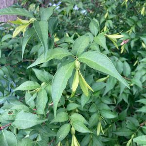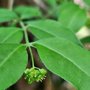🌿ツクバネ🌿衝羽根 (ビャクダン科 ツクバネ属) 🏷️目に青葉~2025 4枚目宜しくお願いします🙇♀️ ・落葉低木 ・半寄生植物 ・雌雄異株 ・花期 5~6月 ・実 10~12月 回転しながら落ちる😍本当だよ🎶 ・半寄生するお相手 カエデ モミ ツガ アセビ等←我が家はモミジ ・実が羽根つきの羽根に似ているから😊 羽根つきの実はムクロジの実● ①② 5月中旬 雄花 何かしらん❓と写真に撮って帰ってからツクバネかぁ〰と気が付く🤣🍆 ③庭のツクバネ 3年目かな❓ 4月中旬 ほんのり紅さして可愛い💕🍃 後ろにチラリと半寄生させて貰ってるモミジの葉が🍁写ってます✌️ ④古いですが 2022 10月中旬 若い実 出先 ⑤5月中旬 あっと思ったらハキリバチ🐝に切り取られてた😅 鉢の巣の準備…どんな巣を作るんだったかな❓ 鉢植え 下に見えるは…巨大化したギボウシ🤣 雌花みたいなぁ〰。 見て頂いてありがとうございます🙏😊