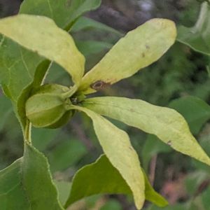 ★ツクバネ(衝羽根)★ ビャクダン科の落葉低木 花期:5~6月 分布:関東地方以西の本州、四国及び九州の一部)佐賀、長崎、大分) 日本固有種。光合成を行う植物だが、ツガやアセビやカエデなどに半寄生しないと生きられない。秋にできる果実の形が羽子板で衝くツクバネに似ているため、名付けられた。 2025.11.3 筑波実験植物園📱